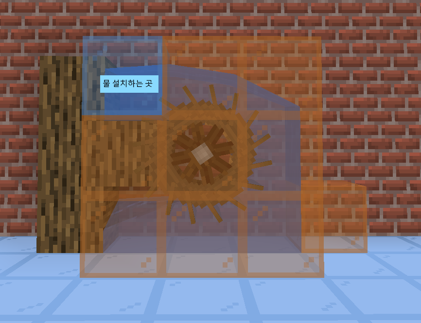 물레방아를 설치한 뒤, 옆으로 물이 새지 않게 막아주고 물레방아 대각선 왼쪽 위 칸에 물을 부어줍니다. 물레방아의 날개가 시계 반대방향으로 약간 꺾여 있어, 물이 시계방향으로 회전하게 만들어야 합니다.